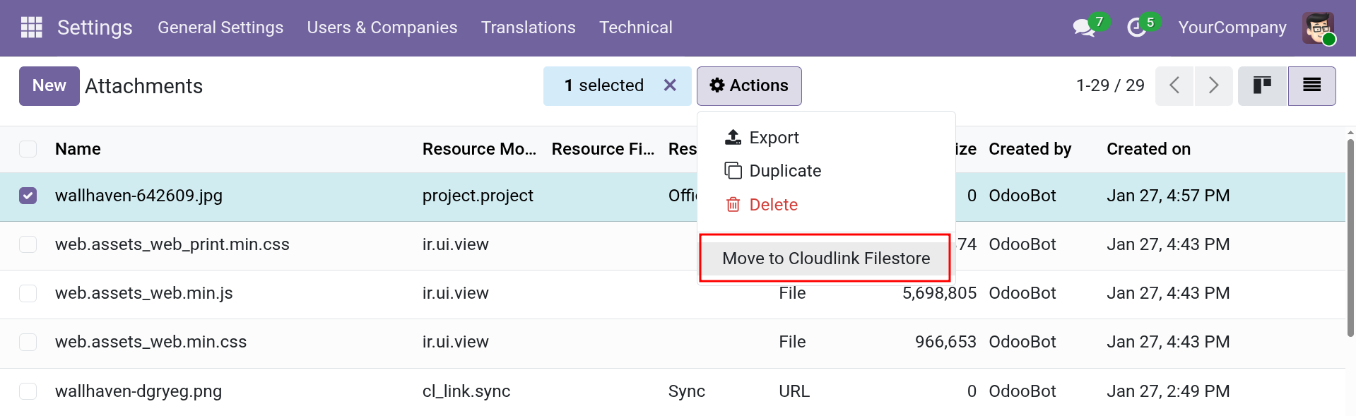If you have existing attachments in Odoo (stored in the database or local filestore) and want to move them to a configured Cloudlink Filestore, you can use the Move to Cloudlink Filestore action.