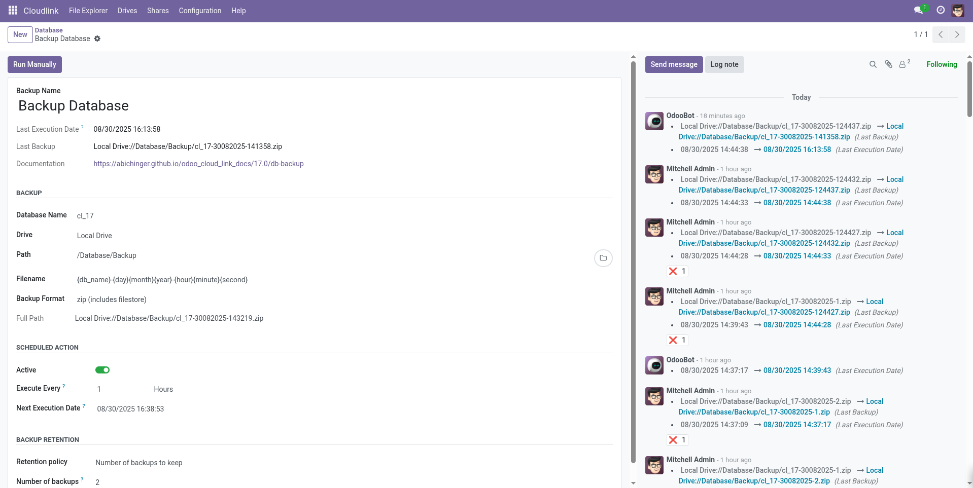 Notifications about backup failures are now sent via the Odoo chatter (followers/messages). To receive notifications, add yourself as a follower to the backup job.