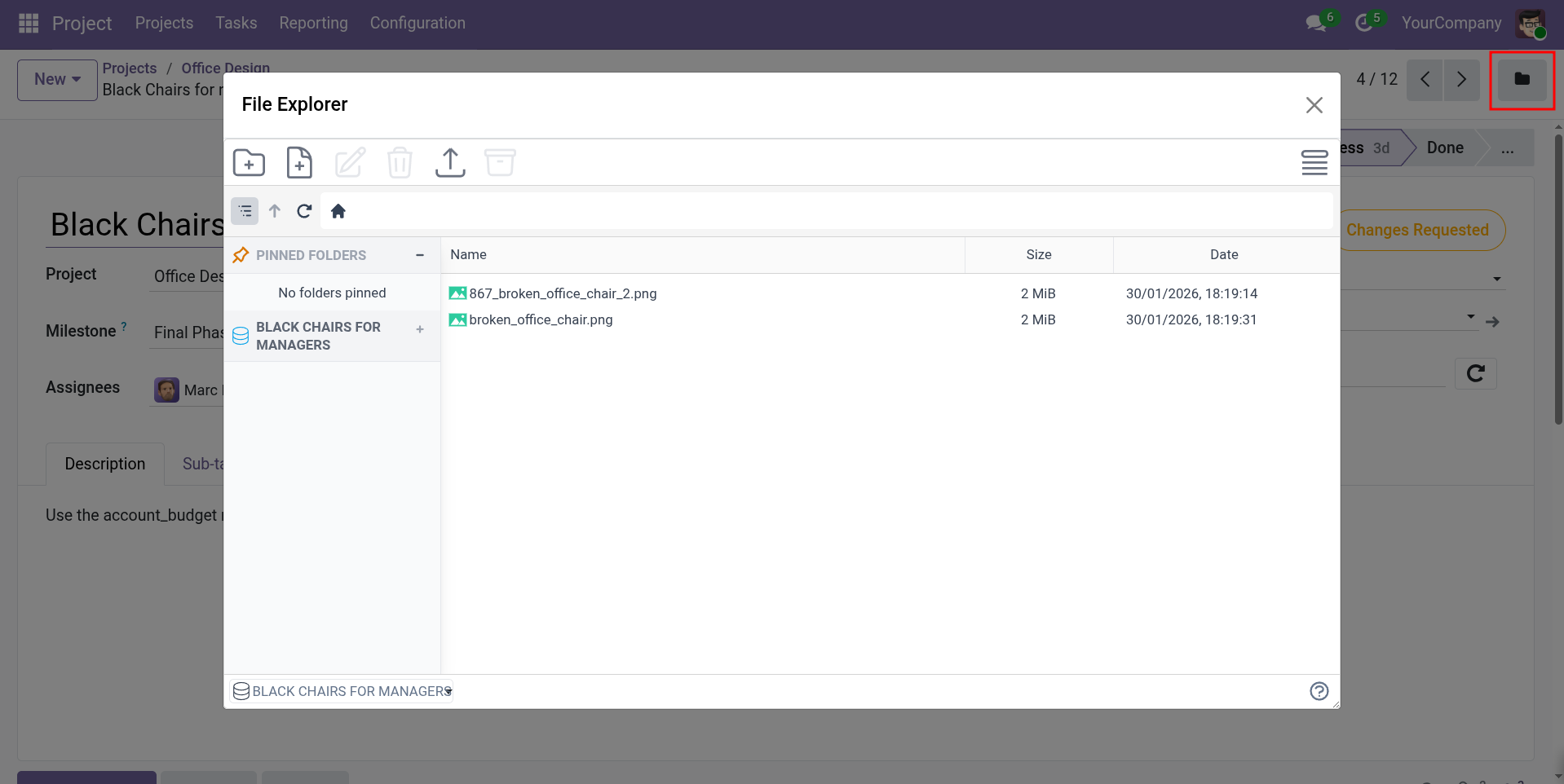 Contextual Access: You can also access the File Explorer directly from Odoo records (like Partners or Sales Orders) if the Filestore is configured with the File Explorer option enabled. This opens a the File Explorer of the files and folders associated with that specific record.